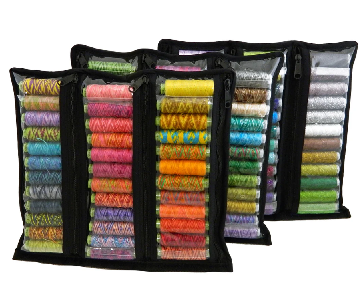 Joanne B. This was just what I needed to keep track of and easily access all of my various threads. I love the clear vinyl so I can see what I have and the zippered pockets keep the thread from rolling around .