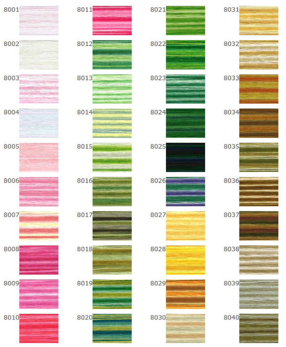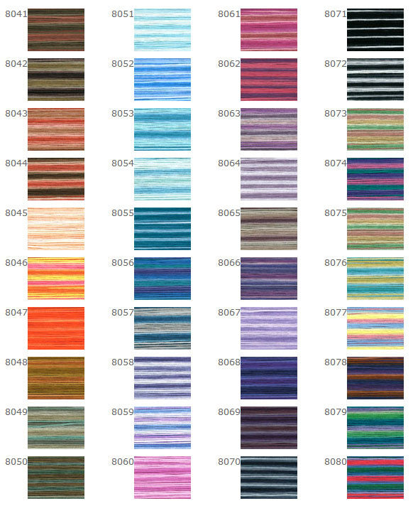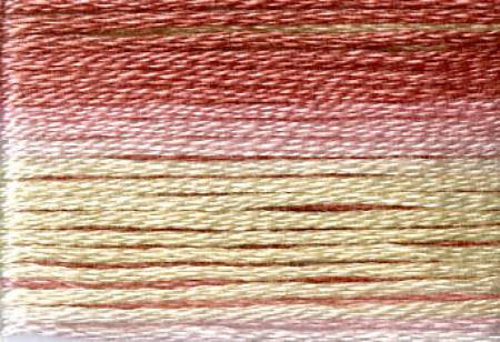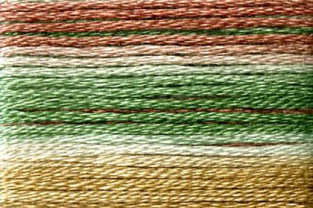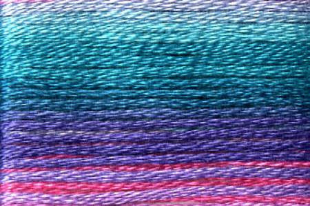 Six strand colorfast, Egyptian cotton floss in approximately 8 yards. Colors change approximately every 12 inches and are ideal for full scale embroidery and large patterns. Available in 80 colors.