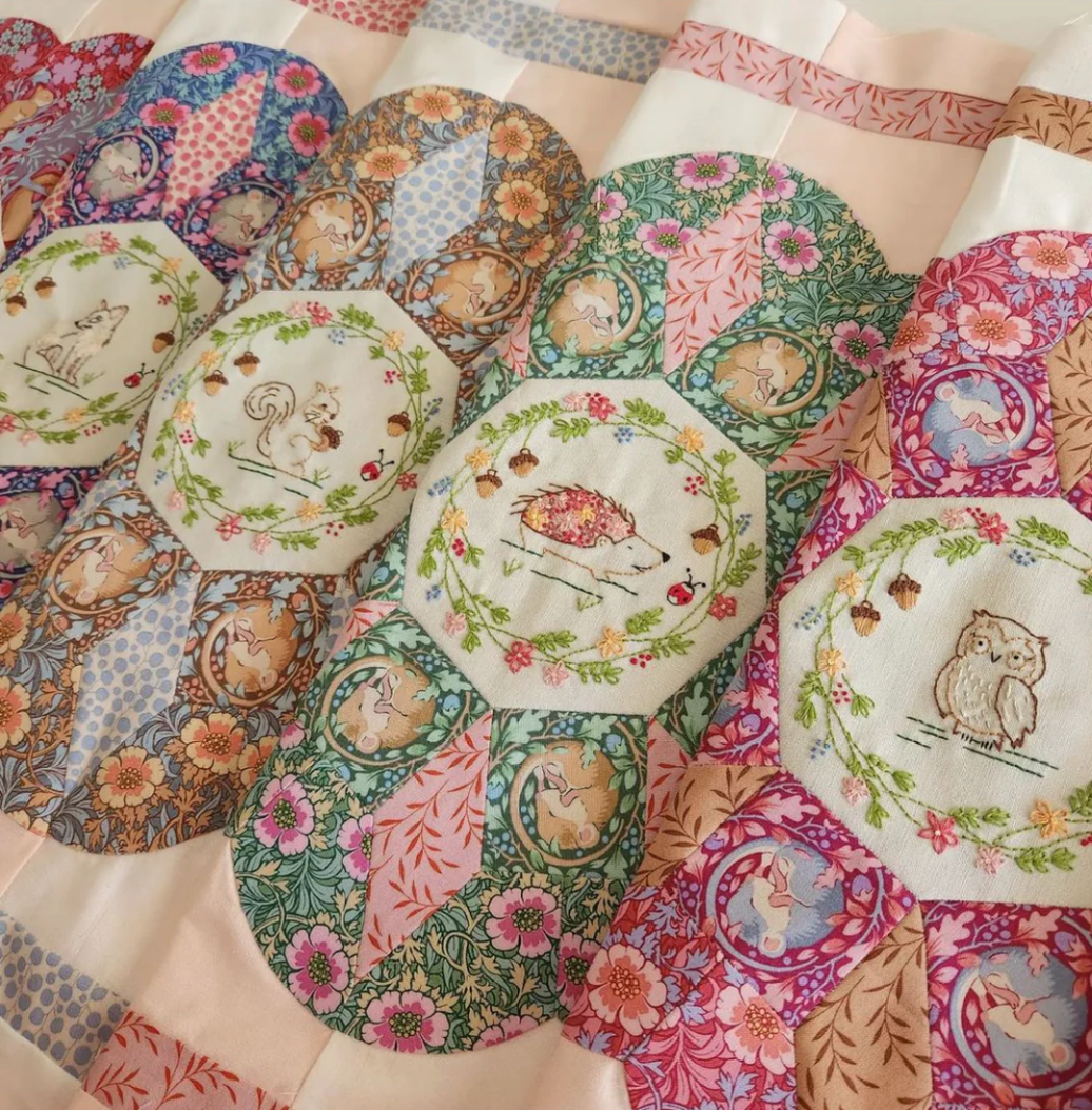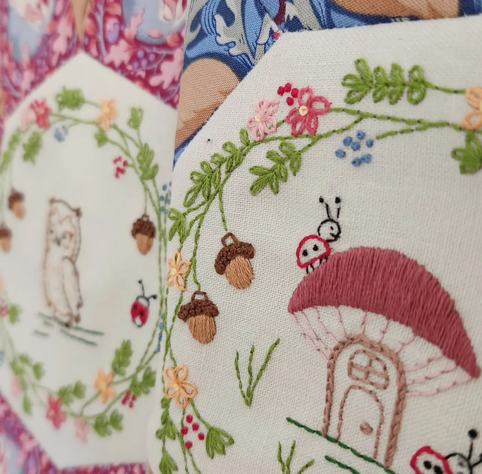 Woodland Wonders combines the techniques of appliqué, EPP, and simple embroidery stitches as well as machine piecing.